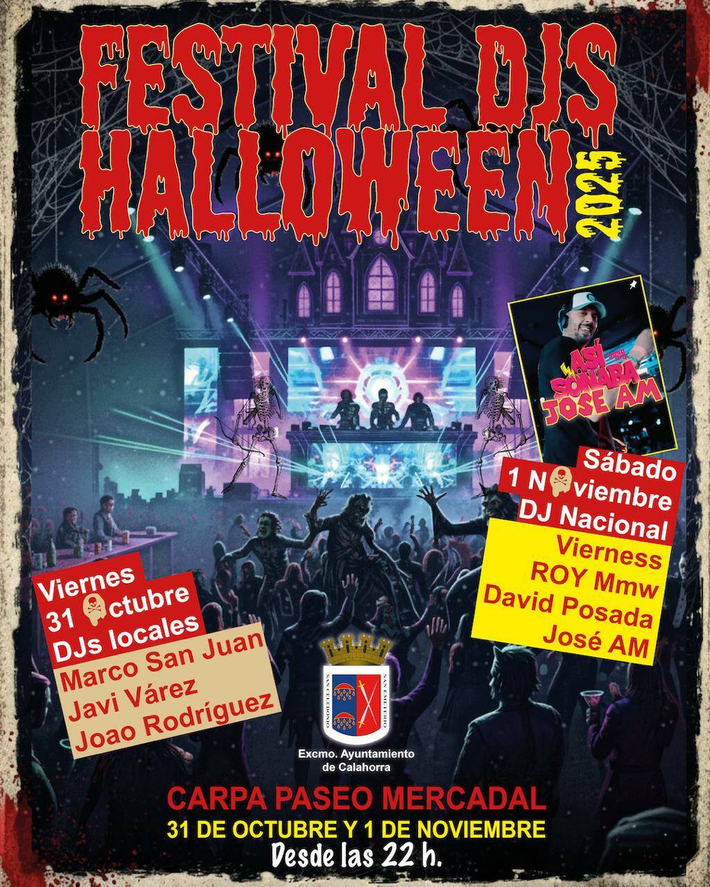 Por la noche, a las 22:00 horas empezará el Festival de música en la carpa instalada en el paseo del Mercadal con los djs locales Marco San Juan, Javi Várez y Joao Rodríguez. Animarán la noche más terrorífica y espeluznante del año con ritmo, luces y música.